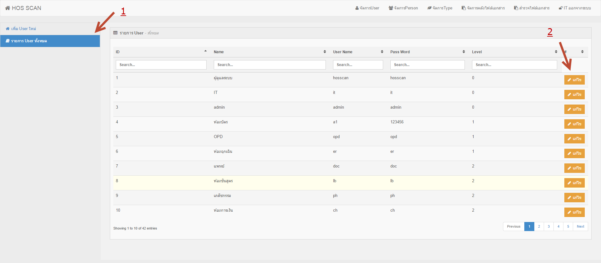 3. เมื่อต้องการ แก้ไขข้อมูล User ให้ทำการคลิก รายการ User ทั้งหมด (หมายเลข 1) แล้วให้ทำการเลือกข้อมูล User แล้วคลิก แก้ไข (หมายเลข 2)