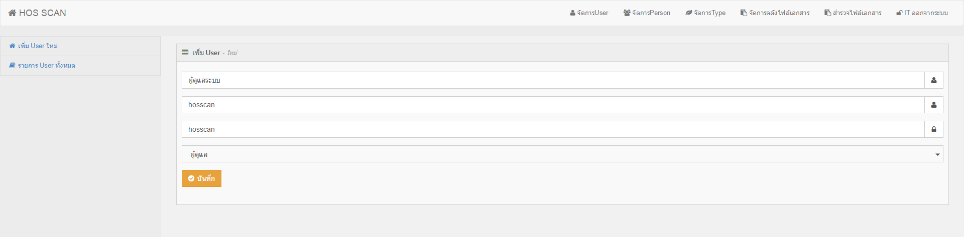 2. เมื่อคุณต้องการเพิ่ม User ใหม่ ให้ทำการคลิก เพิ่ม User และให้กรอกรายละเอียดดังภาพ แล้วกดบันทึก