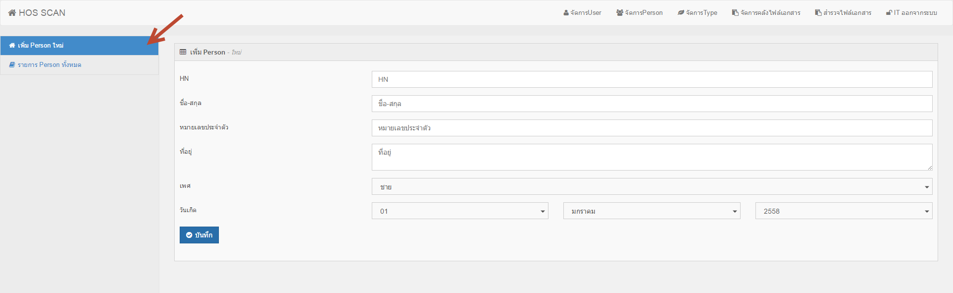 1. เมื่อล็อกอินเข้าสู่ระบบแล้วให้ทำการคลิกที่เมนู จัดการ Person คุณจะพบหน้าจอ ดังภาพ