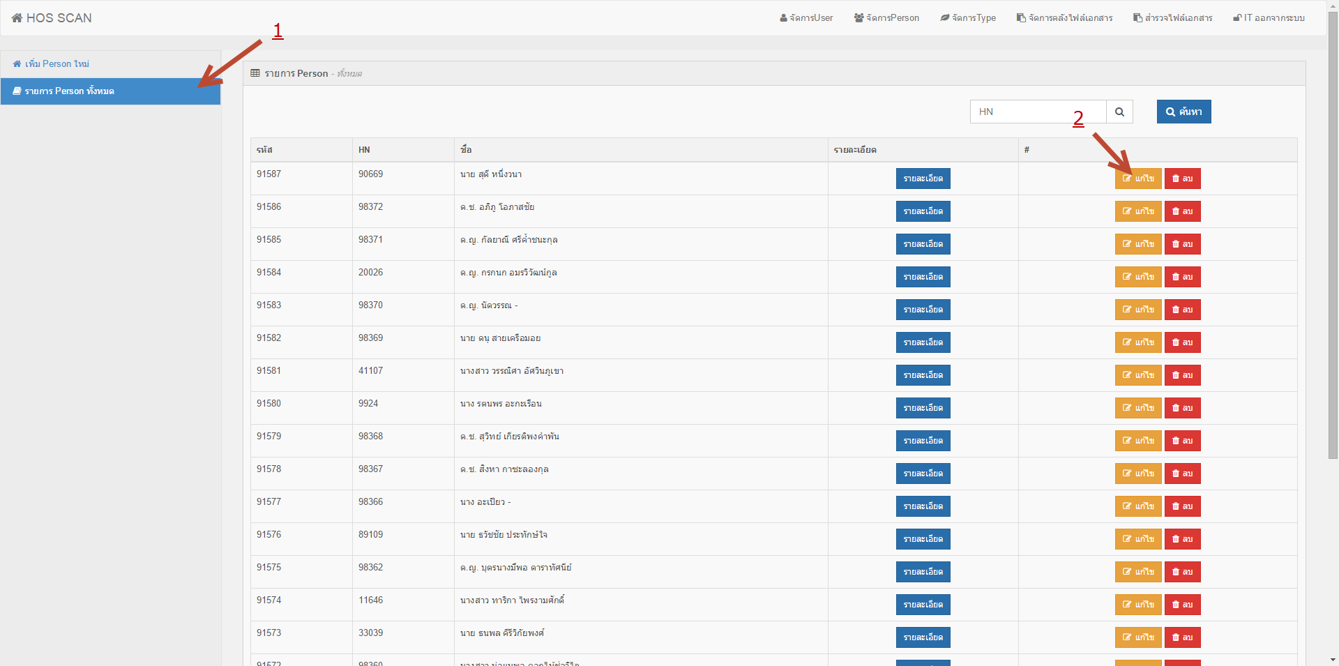 3. เมื่อต้องการ แก้ไขข้อมูล Person ให้ทำการคลิก รายการ Person ทั้งหมด (หมายเลข 1) แล้วให้ทำการเลือกข้อมูล Person แล้วคลิก แก้ไข (หมายเลข 2)