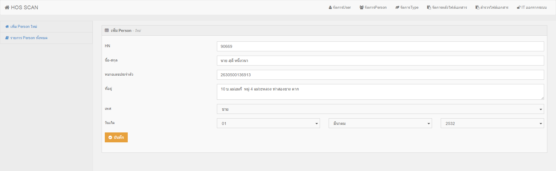 2. เมื่อคุณต้องการเพิ่ม Person ใหม่ ให้ทำการคลิก เพิ่ม Person และให้กรอกรายละเอียดดังภาพ แล้วกดบันทึก