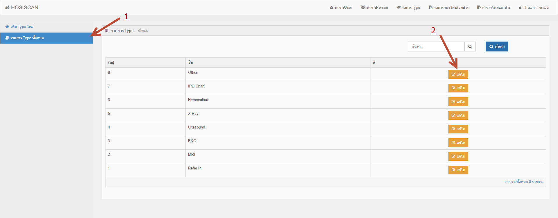 3. เมื่อต้องการ แก้ไขข้อมูล Type ให้ทำการคลิก รายการ Type ทั้งหมด (หมายเลข 1) แล้วให้ทำการเลือกข้อมูล Person แล้วคลิก แก้ไข (หมายเลข 2)