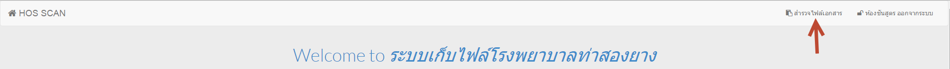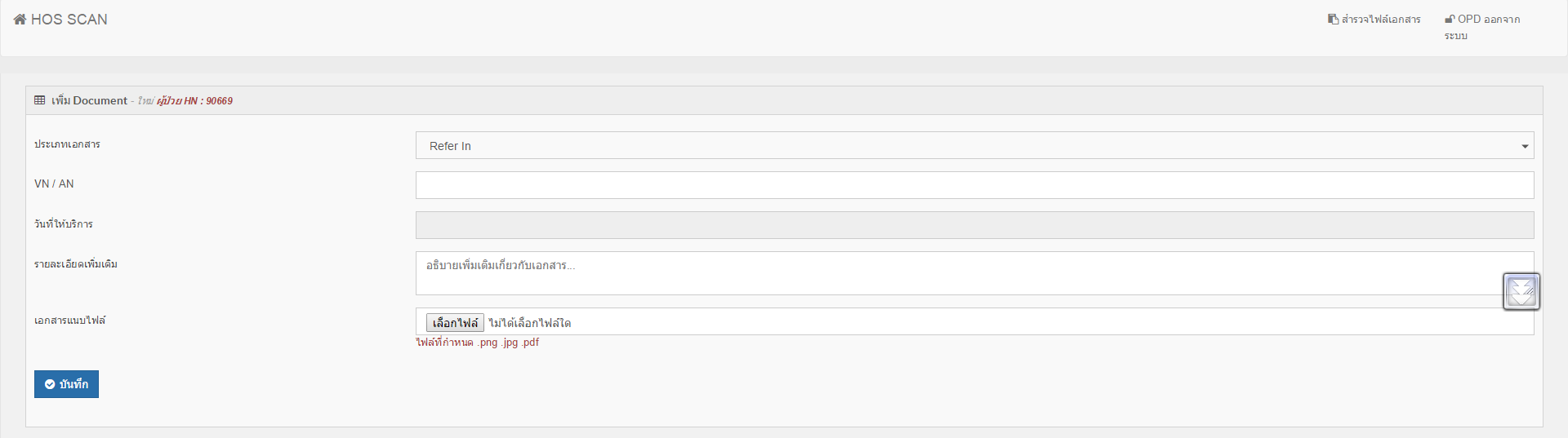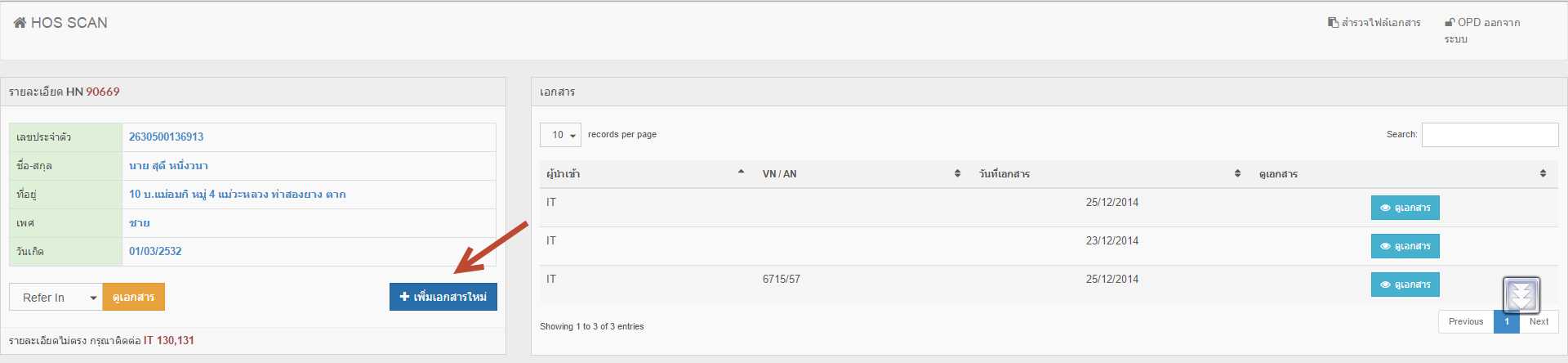 1. ให้คลิกเมนู สำรวจไฟล์เอกสาร เลือกผู้ป่วยให้เรียบร้อย แล้วกดปุ่มดูเอกสาร แล้วให้สังเกตุด้านล่างของประวัติผู้ป่วยจะมีปุ่มสีน้ำเงิน เพิ่มเอกสารใหม่ ให้คลิกเข้าไป