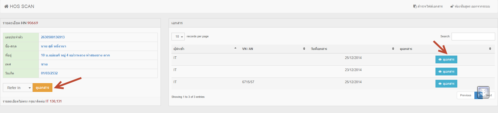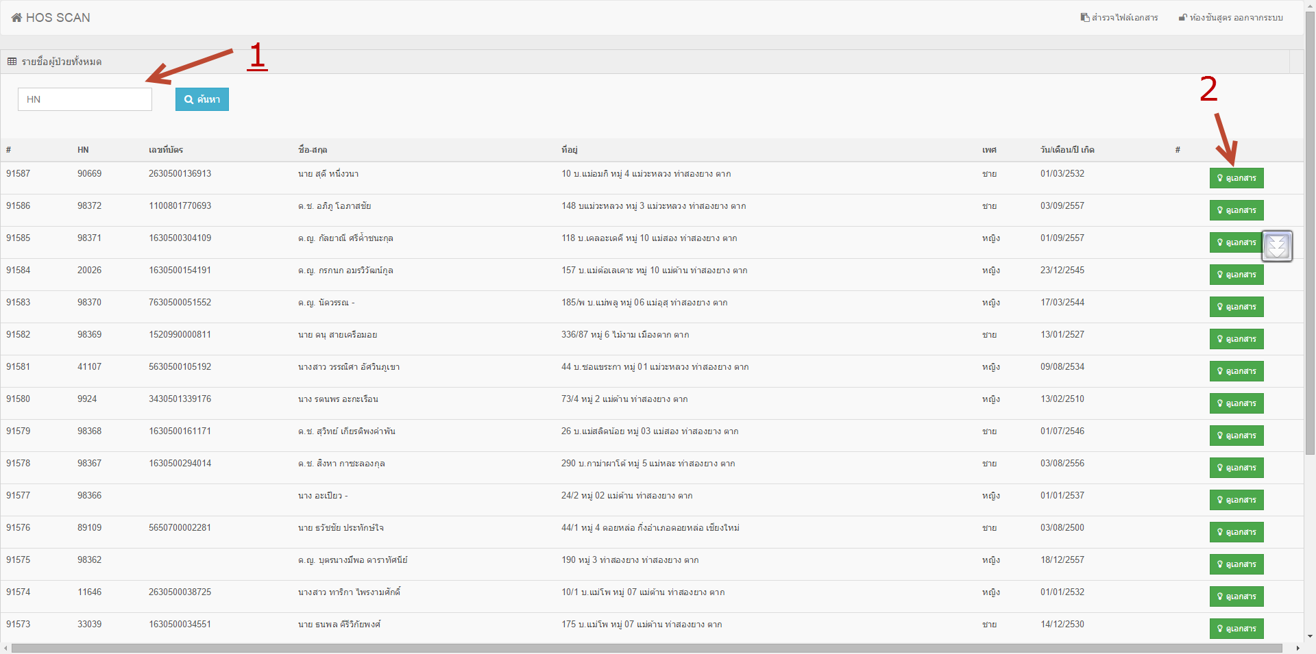 5. เมื่อ คลิกเข้าสู่เมนู สำรวจไฟล์เอกสาร เรียบร้อยแล้ว คุณจะพบหน้าจอการสำรวจไฟล์ หมายเลข 1 คือการค้นหาผู้ป่วยจาก HN เมื่อเราพบผู้ป่วยแล้วให้เราทำการคลิกที่ ดูเอกสาร หมายเลข 2
